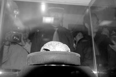 據(jù)北京娛樂信報(bào)報(bào)道,30日上午10時(shí)30分左右,在數(shù)名手持沖鋒槍的房山公安分局防爆隊(duì)隊(duì)員的嚴(yán)密監(jiān)視下,北京人頭蓋骨枕骨化石從中科院安然運(yùn)抵周口店北京人遺址博物館,被安放在防彈玻璃罩中展出,這次展出將持續(xù)到10月14日。