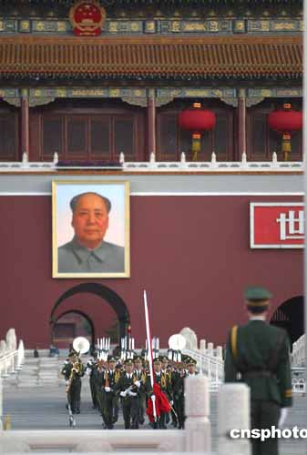 更多人則被裹挾在自東向西或逆向的人流中,以一分鐘不足十米的速度移動(dòng)。這個(gè)速度在天安門城樓附近將繼續(xù)放緩,逾三成游客因與主席像留影而滯留。這幅新繪的主席像剛于日前更換,據(jù)作者說,其面部表情更為親和。