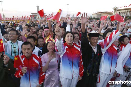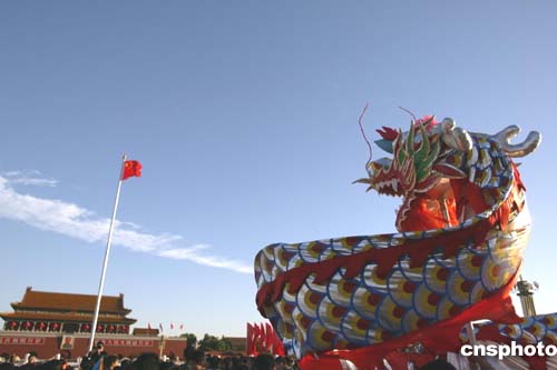 而另一位表情同樣親和的偉人,孫中山先生,其像在城樓對(duì)面廣場(chǎng)上矗立。來自北京各高校及其他各界人士,此時(shí)正在廣場(chǎng)歡歌起舞。一小時(shí)半前,他們剛剛在此觀看了升旗儀式。那一刻,近處奧運(yùn)倒計(jì)時(shí)器的顯示為一千四百零七天十二小時(shí)零五十一分鐘。