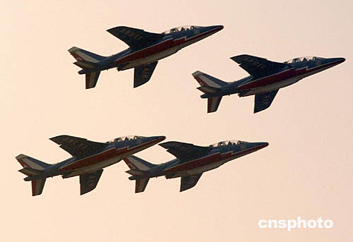 “法蘭西巡邏兵”特技飛行表演隊(duì)“阿爾法”飛機(jī),十月六日下午在北京南苑機(jī)場(chǎng)進(jìn)行飛行預(yù)演,精彩的飛行表演,博得北京觀眾喝彩。由于天氣能見(jiàn)度極低,許多高難度飛行科目未能如期進(jìn)行。中新社記者:鄒憲