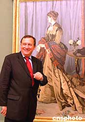 | “法國印象派繪畫珍品展”中外記者招待會十月八日在中國美術(shù)館舉行。法國奧賽博物館館長勒穆瓦納先生向媒體介紹克勞德·莫奈的作品《戈迪拜爾夫人》!胺▏∠笈衫L畫珍品展”將于十月十一日至十一月二十七日在中國美術(shù)館舉行。本次展覽展出法國精選出的51幅具有代表性的印象派作品,它們均出自法國印象派繪畫史上最重要的十四位畫家之手,這也將是中國舉行的水平最高、最為重要的一次西方繪畫作品展。作為“法國文化年”項目的重頭戲,法國國家收藏品中的印象派珍品將于二零零四年十月起,連續(xù)六個月在在中國北京、上海、香港展出。作者:張勤