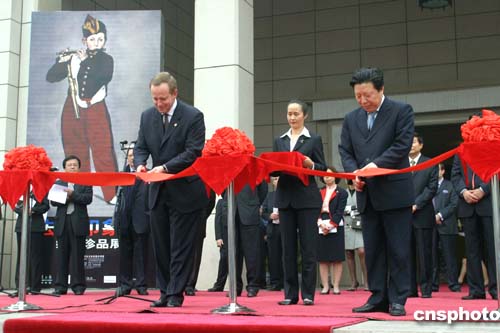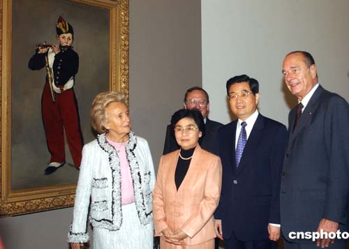 中新社北京十月十日電(記者李靜)“法國印象派珍品展”今天在中國美術(shù)館開幕,中國國家主席胡錦濤和在華訪問的法國總統(tǒng)希拉克,以及兩國元首的夫人一道觀看了畫展,法國奧賽博物館館長樂莫瓦納兼任全程解說。
