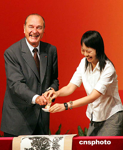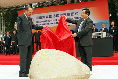 素有“中國(guó)情結(jié)”的法國(guó)總統(tǒng)希拉克今天一到上海就來(lái)到著名高等學(xué)府同濟(jì)大學(xué),向全中國(guó)青年滿(mǎn)懷感情地表達(dá)來(lái)自法國(guó)的友誼與共同接受新世紀(jì)挑戰(zhàn)的美好愿望,并接受了中國(guó)學(xué)子寓意中法友誼長(zhǎng)存的禮物。