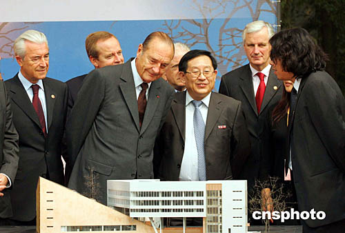 演講之前,希拉克出席了中法中心的奠基儀式。他一邊聽(tīng)講解,一邊仔細(xì)觀看了即將破土動(dòng)工的中法中心模型。他在演講中說(shuō),很高興能夠參觀中法科技創(chuàng)新中心的建筑模型,并稱(chēng)之為中法合作精神的重要體現(xiàn)。