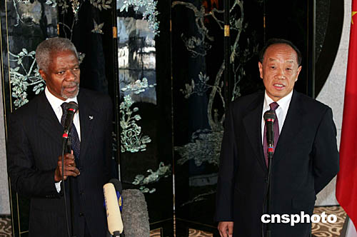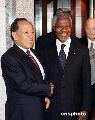 中國(guó)外交部長(zhǎng)李肇星十月十一日在北京釣魚(yú)臺(tái)國(guó)賓館與來(lái)訪的聯(lián)合國(guó)秘書(shū)長(zhǎng)安南舉行會(huì)談。中新社記者:毛建軍