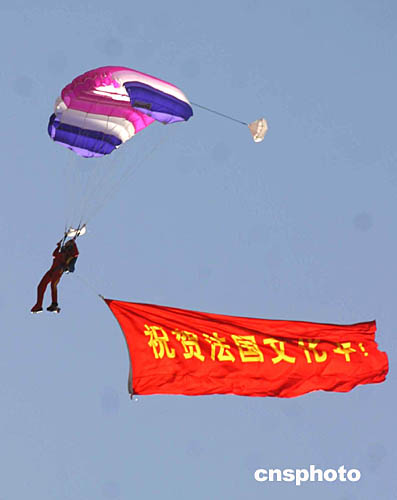 十月十一日,為祝賀法國文化年在中國舉行,中國人民解放軍空軍在法國空軍“法蘭西巡邏兵”飛行表演后,進(jìn)行了跳傘表演。圖為跳傘隊(duì)員在空中打開醒目的標(biāo)語。中新社記者:張勤