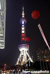 十月十一日,法國總統(tǒng)希拉克抵達(dá)上海訪問。上海浦東東方明珠電視塔用紅、藍(lán)、白三色彩燈迎接貴賓到訪。作者:潘索菲