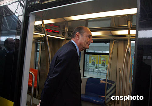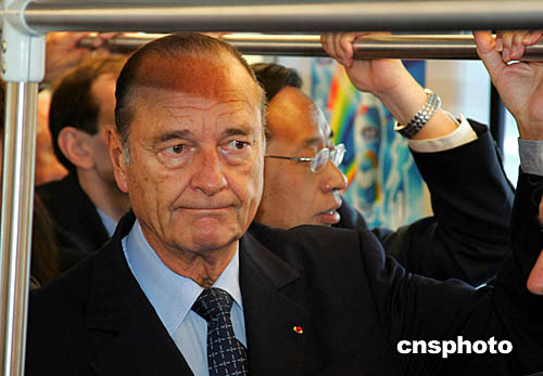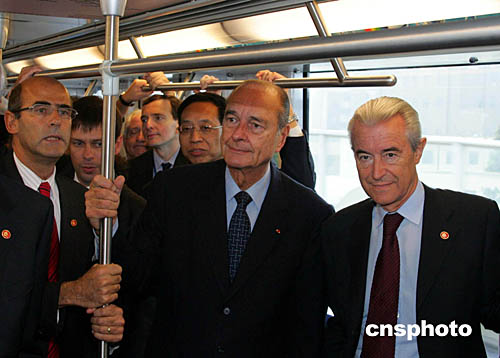 十月十二日,法國總統(tǒng)希拉克參觀、乘坐上海軌道交通三號線,并見證“上海地鐵一號線車輛續(xù)購項目合同簽字儀式”。上海申通集團(tuán)有限公司將購置一百二十八輛中法合作生產(chǎn)的地鐵車輛,二十二個月后這些車輛將陸續(xù)投入營運。作者:潘索菲