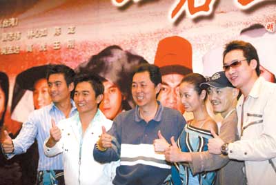 《一石二鳥》是今年明星陣容非常強(qiáng)的賀歲搞笑片。吳宗憲、林心如、雪村、陳龍、吳孟達(dá)、曾志偉、高虎,7位內(nèi)地、香港、臺灣的大腕明星都在片中有精彩表演。正像雪村昨天在發(fā)布會上所說的,這部片子是個純粹的商業(yè)電影,“就是沖著錢去的!痹趹蛑,本來就有喜劇效果的雪村穿上了難得一見的古裝戲服,頭發(fā)也被設(shè)計成了雷震子的發(fā)式,更大膽使用鐵鍬作為自己的防身武器,實在是搞笑得不得了。而吳宗憲更是與林心如大演親熱對手戲。