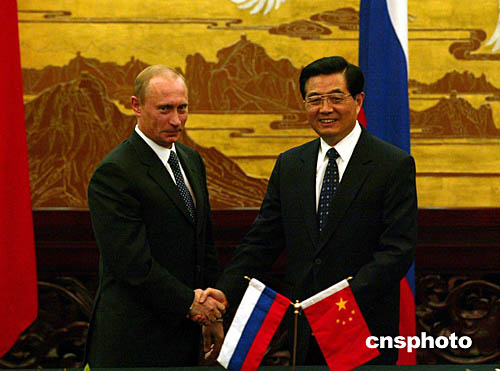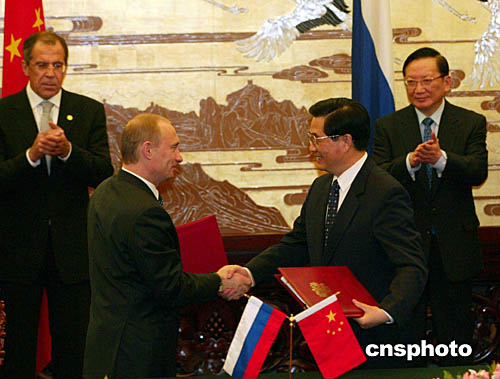 普京完全贊同胡錦濤的看法和建議,他說,發(fā)展俄中合作是俄一貫政策!抖碇心类徲押煤献鳁l約》為兩國關(guān)系發(fā)展奠定了重要基礎(chǔ),雙方解決邊境問題、就俄加入世貿(mào)組織達(dá)成協(xié)議是兩國戰(zhàn)略協(xié)作伙伴關(guān)系的體現(xiàn)。我們愿與中方切實落實該條約的實施綱要,推動雙方在各領(lǐng)域的合作。俄方希望加強(qiáng)經(jīng)貿(mào)合作,爭取在數(shù)量和質(zhì)量上均不斷提高。他重申,俄方關(guān)于同中國的能源合作的決定始終未變,也愿同中國加強(qiáng)在科技、人文等領(lǐng)域的合作。