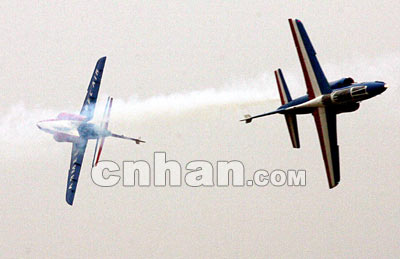 果然,經(jīng)過(guò)十多分鐘平淡無(wú)奇的單飛后,1號(hào)飛機(jī)著陸了,7號(hào)、8號(hào)飛機(jī)相繼升空。3時(shí)38分,兩架飛機(jī)做了當(dāng)天最驚險(xiǎn)也是惟一驚險(xiǎn)的動(dòng)作——對(duì)飛閃避:兩架飛機(jī)南北相向飛行,當(dāng)距離20米左右時(shí),兩機(jī)各向外側(cè)翻轉(zhuǎn)90度,兩機(jī)擦身而過(guò),藍(lán)色和紅色的尾煙在天空劃出一道美麗的弧線?吹降挠^眾一片驚呼,沒(méi)看到的大失所望。10分鐘后,表演順利結(jié)束。