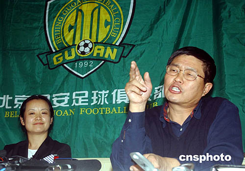 北京國(guó)安足球俱樂部有限責(zé)任公司首席律師王玉梅(左)在會(huì)上宣布國(guó)安正式啟動(dòng)向中國(guó)足協(xié)的申訴程序,總經(jīng)理?xiàng)钭嫖洌ㄓ遥┫蛎襟w傳達(dá)了俱樂部董事會(huì)決定用法律手段解決與中國(guó)足協(xié)矛盾的決心。