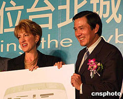 圖為惠普總裁卡莉·菲奧莉娜與臺北市長馬英九共同出席簽約儀式。