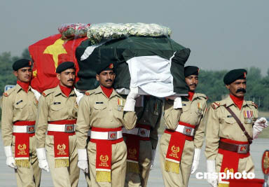 巴基斯坦禮兵抬著王鵬的靈柩走向?qū)C(jī)