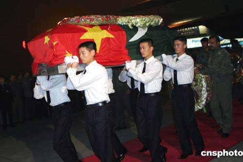 中新社濟南十月十六日電 (記者 王魯平 胡洪林)在巴基斯坦人質(zhì)綁架事件中遇難的中國工程師王鵬遺體,今晚八點四十五分由巴基斯坦的專機運回,抵達山東省濟南國際機場,中國外交部、商務(wù)部、山東省人民政府等有關(guān)部門的官員在濟南機場舉行莊嚴的靈柩迎接儀式。