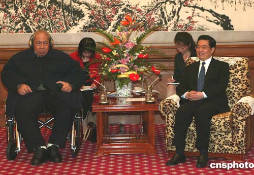中新社北京十月十八日電(記者齊彬)中國國家主席胡錦濤今天下午在會見湯加國王圖普四世時表示,我們贊賞圖普四世國王為實現(xiàn)中湯關(guān)系正;鞒龅闹匾暙I(xiàn),感謝湯加堅持一個中國政策、支持中國在臺灣問題上的正義立場。