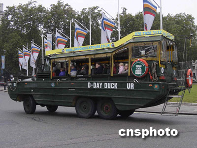 對(duì)游客來(lái)說(shuō),一些造型奇異的觀光車(chē)也許會(huì)讓他們對(duì)倫敦這座歷史老城留下更特別的回憶。比如,在大本鐘下,我們?cè)吹皆煨湍7庐?dāng)年諾曼底戰(zhàn)役中盟軍登陸艦的觀光車(chē)雄赳赳氣昂昂地駛過(guò)。