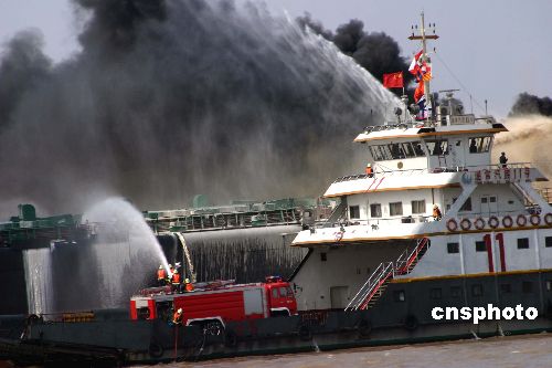 搶救落水人員的工作剛完成,失事油船突然爆炸起火,現(xiàn)場(chǎng)施救指揮中心緊急調(diào)派載有消防車的消防拖輪到達(dá)現(xiàn)場(chǎng),對(duì)起火油輪進(jìn)行滅火。長(zhǎng)江不僅是重要的運(yùn)輸通道,更是重要的飲用水源。在演習(xí)現(xiàn)場(chǎng)周圍,清污船開始向江中噴射消防泡沫,在江面聚積的泡沫可以對(duì)爆炸油輪噴灑出來的油污進(jìn)行有效地清除,最大限度的降低對(duì)江水的污染。