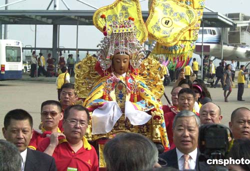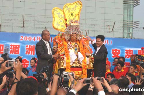 二十一日下午三時,湄洲媽祖金身乘搭專機(jī)從福州飛抵澳門,澳門中華媽祖基金會在澳門國際機(jī)場舉行隆重的接駕儀式,澳門中華媽祖基金會副主席陳明金等為媽祖金身披上金披鳳。