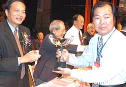 臺灣中華美食交流協(xié)會、馬祖餐飲協(xié)會、金門觀光訪問團,十月二十三日在第十四屆中國廚師節(jié)暨海峽兩岸美食節(jié)閉幕式上獲得組委會頒發(fā)的特別貢獻獎。圖為原中國商務部部長胡平(圖中)、福州市市長練知軒(圖左一)等為有關獲獎代表頒獎。作者:劉可耕