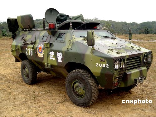 2004年10月25日,在武警某部訓(xùn)練場,新型防暴運兵車和防暴裝甲車與武警“反恐”隊員配合,共同實施“反恐”演練。該型防暴車為中國自行生產(chǎn),使用防彈鋼板制造,可有效預(yù)防7.62MM鋼心彈射擊,撞擊24CM厚磚墻,爬坡31度;輪胎內(nèi)帶有進(jìn)口防爆液,在中彈瞬間能迅速封堵并繼續(xù)行駛50KM。該型防暴車最高時速可達(dá)100KM/H,所配備10M超短波天線能在2500KM內(nèi)接收短波信號。作者:王耀武
