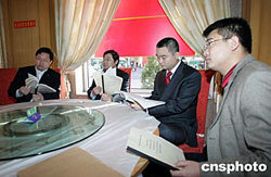 大連實(shí)德俱樂部董事長徐明(左一)、北京國安俱樂部總經(jīng)理羅寧(左二)、深圳鍵力寶老總張海(右二)等準(zhǔn)備會議材料。