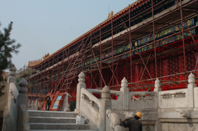 晉宏逵:對于1400名施工人員,一是對這些工人尤其是工長及他們的負(fù)責(zé)人,在進(jìn)入故宮之前都進(jìn)行培訓(xùn),我們叫做持證上崗。二是能夠進(jìn)入故宮的單位都是經(jīng)過招標(biāo)的,它們都擁有國家文物局頒發(fā)的一級文物建筑維修施工和設(shè)計證書。三是故宮和施工單位一起制定了一整套現(xiàn)場管理措施,包括人員、技術(shù)、材料進(jìn)出廠的管理等。通過這些管理手段來保證故宮維修的安全。四是施工單位都是利用傳統(tǒng)方法來進(jìn)行施工的,能夠保證維修工作不改變建筑原狀。另外從技術(shù)措施上,我們也想了很多辦法。比如說對比較重要的墻,他們對每一塊磚都做了編號。在這些建筑隊伍進(jìn)場之前,我們已經(jīng)也做了充分的考慮,不僅僅要保證建筑的安全,還要保證游客的安全,因?yàn)槲覀兊木S修是在不關(guān)閉多個館的情況下進(jìn)行的,我們劃定了比較嚴(yán)格的區(qū)域進(jìn)行管理。施工工人只在上班時進(jìn)入故宮,不能在故宮居住。