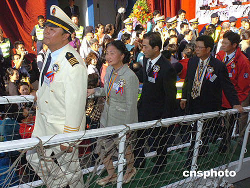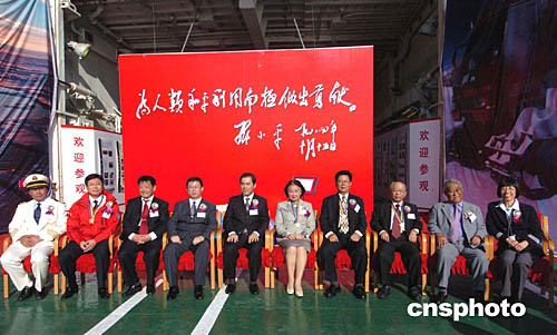 香港律政司司長(zhǎng)梁愛詩等嘉賓登上“雪龍?zhí)枴逼票?#65104;并在鄧小平題詞下合影。