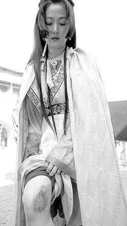 休息了一個(gè)小時(shí)后,王思懿又重新上馬繼續(xù)拍攝了,只是上下馬、走路時(shí)需要人攙扶著。而剛才還不省人事的王思懿跟沒事似的對(duì)記者做了個(gè)鬼臉,“騎馬要坐著,沒事的!倍稚先际莿偛趴呐隽粝碌膫。思懿大拇指骨節(jié)處一塊凸起引起了記者的注意,思懿指著手說,這是前不久拍舞刀戲時(shí),用力過猛,大拇指骨折留下的痕跡,現(xiàn)在還沒恢復(fù)。而話音未落,王思懿更撩起褲腿,膝部被一塊碗口大小的深紫血印整個(gè)覆蓋,真是慘不忍睹,“這是在拍攝一場(chǎng)打戲時(shí)腿部躲閃慢了一步,刀劈到腿上的結(jié)果!彼架舱f,當(dāng)時(shí)疼得要命,整個(gè)膝蓋腫得老高,比這次還嚇人。不僅如此,因?yàn)橐╂z甲,思懿的腰上和肩上也磨出了一道道血印。不過,當(dāng)被問到苦不苦時(shí),思懿卻表示早已習(xí)慣了,“這點(diǎn)小傷不算什么,拍武戲哪有不受傷的,每次拍攝時(shí)都不覺得疼,只是回去洗澡時(shí)才發(fā)覺:‘唉?怎么這么疼,全都破了。’”