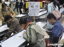 2005年全國碩士研究生招生首次在全國范圍內(nèi)試行網(wǎng)上報名,考生須于11月10日至14日到省級招生辦指定的報考點確認報名信息才能有效。圖為報考中國人民大學(xué)碩士研究生的學(xué)生11月10日在現(xiàn)場仔細核對自己的報名信息。作者:張碩