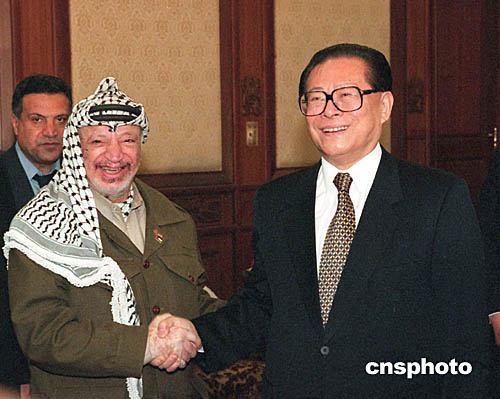 1999年4月15日,江澤民在北京釣魚臺國賓館會見巴勒斯坦國總統(tǒng)阿拉法特。中新社記者:李剛