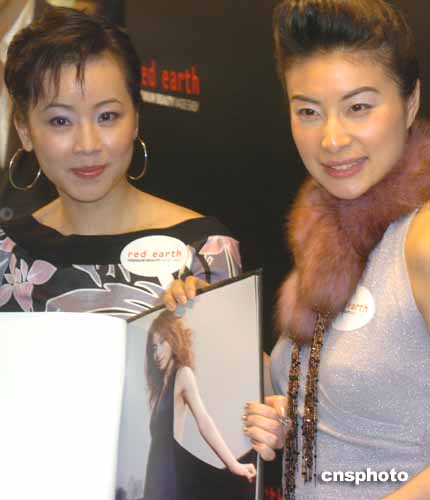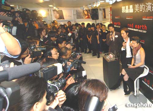 郭晶晶在現(xiàn)場接受化妝品公司高層贈送的禮品。作者:趙振清