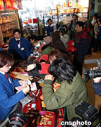 11月19日,數(shù)百名北京市民在菜百商場(chǎng)排隊(duì)購(gòu)買(mǎi)雞年賀歲金條。盡管黃金價(jià)格連年看漲,賀歲金條的價(jià)格由三年前的99元/克漲至今年的125元/克,仍未擋住北京市民的購(gòu)買(mǎi)熱情。中新社記者:史利