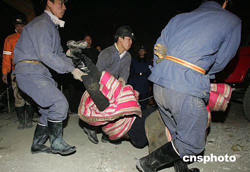 中新社沙河十一月二十二日電(記者孫宇挺)今天下午六點(diǎn)半,伴隨著一聲尖銳的信號鈴聲,位于著火點(diǎn)的白塔鎮(zhèn)章村李生文礦的八位受困人員開始升井,十五分鐘以后,所有八具用棉被包裹的尸體全部從白塔鎮(zhèn)二鐵礦直井口運(yùn)出,至此,河北沙河市“一一·二0”礦難事故死亡人數(shù)上升至五十七人,此次礦難事故中受圍困的一百零六人仍有三人下落不明。