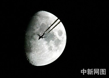 在德國(guó)紐倫堡的夜空中,一架客機(jī)飛過(guò)月亮?xí)r拍攝的圖片。