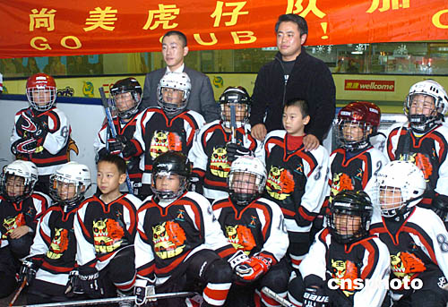 2004年亞太區(qū)少兒冰球賽25日在香港西九龍中心舉行﹐北京尚美虎仔隊(duì)(黑衣)以六比零戰(zhàn)勝香港隊(duì)。
