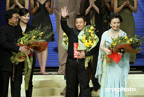 中國國際時裝周第八屆中國時裝設(shè)計“金頂獎”十一月二十五日晚在北京揭曉,“云敦至尊”品牌設(shè)計師計文波(中)摘得桂冠。中新社記者:盛佳鵬