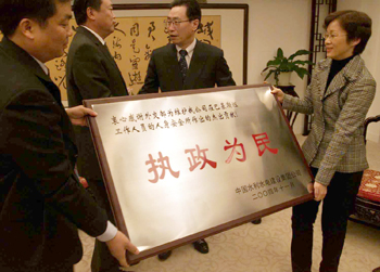 中新網(wǎng)11月26日電 中國外交部副部長武大偉今天在外交部接受了中國水利水電集團(tuán)公司贈(zèng)送的“執(zhí)政為民”匾牌。