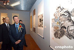 由人民日?qǐng)?bào)與澳門日?qǐng)?bào)合辦的“回歸情——慶祝澳門回歸祖國(guó)五周年書畫展”,二十六日下午在澳門旅游活動(dòng)中心隆重揭幕,行政長(zhǎng)官何厚鏵出席并參觀了書畫展。作者:梁永強(qiáng)