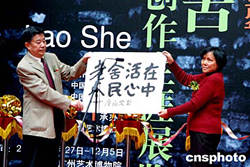 為紀(jì)念老舍先生誕辰一百零五周年,由中共廣州市委宣傳部、中國老舍研究會與中國現(xiàn)代文學(xué)館聯(lián)合舉辦的《老舍文學(xué)創(chuàng)作生涯展覽》十一月二十七日在廣州藝術(shù)博物院隆重開幕。著名漫畫家廖冰兄先生書寫的《老舍活在人民心中》賀詞由女兒廖凌兒代贈送給老舍先生之子舒乙教授。作者:劉衛(wèi)勇