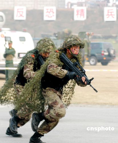 處置大規(guī)模劫持人質(zhì)事件演練中,兩名偽裝后的武警特戰(zhàn)隊(duì)員迅速出擊。
