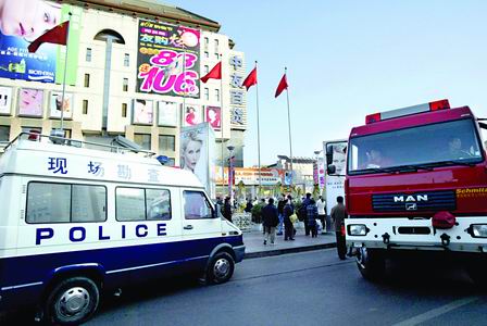 昨天下午1點(diǎn),北京西單中友百貨遭到“炸彈”恐嚇。為防止爆炸后起火,20輛消防車(chē)守衛(wèi)在中友旁邊。