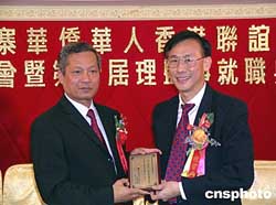 二十七日晚,柬埔寨華僑華人香港聯(lián)誼會在此間假借尖沙嘴海港城皇宮大酒店,舉辦成立慶典暨第一屆理監(jiān)事就職典禮。柬埔寨王國駐香港總領事館陳明光總領事(左)到會致賀辭,并接受首任會長鄭中贈送的紀念品。作者:關向東
