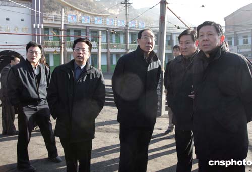 國(guó)有企業(yè)陜西銅川礦務(wù)局陳家山煤礦11月28日發(fā)生特大瓦斯爆炸事故,以國(guó)務(wù)院副秘書長(zhǎng)尤權(quán)(右三)為組長(zhǎng)的國(guó)務(wù)院工作組抵達(dá)后,29日上午在現(xiàn)場(chǎng)指導(dǎo)和協(xié)調(diào)人員進(jìn)行搶救并開展事故調(diào)查工作。陜西省代省長(zhǎng)陳德銘(右一)和國(guó)家安全監(jiān)管局副局長(zhǎng)趙鐵錘(右二)等也在現(xiàn)場(chǎng)組織搶救。作者:任晨鳴
