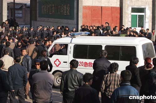 十一月二十九日下午,救護(hù)車在發(fā)生瓦斯爆炸事故的陜西銅川礦務(wù)局陳家山煤礦外待命,隨時(shí)準(zhǔn)備救治至今下落不明的礦工。作者:任晨鳴