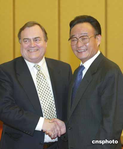 十二月一日,全國人大常委會委員長吳邦國在北京人民大會堂會見了英國副首相約翰·普雷斯科特。作者:廖文靜