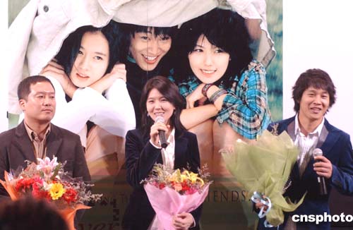 | 十二月三日,二零零四北京韓國(guó)電影展在北京新世紀(jì)影院舉行首映式,韓國(guó)導(dǎo)演姜帝圭、金基德、金容華、李翰,演員車太賢、李恩宙、張伸瑛等明星集體亮相。圖為韓國(guó)導(dǎo)演李翰(左一)、李恩宙(中)車太賢(右一)在觀眾見面會(huì)上為《向左走向右愛》造勢(shì)。作者:韓藝冰