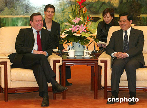 中國國家主席胡錦濤十二月七日在北京會(huì)見德國總理施羅德。中新社記者:滿會(huì)喬