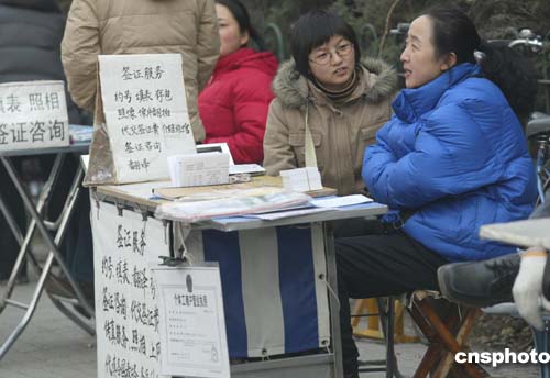 十二月八日,美國大使館簽證處門口的個體服務(wù)一條龍生意火爆,前來咨詢的北京市民絡(luò)繹不絕。