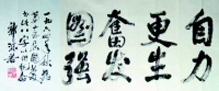 據(jù)了解,這幅寫在1.42米×3.57米宣紙上的行書“自力更生奮發(fā)圖強”,八個字蒼勁有力、氣勢磅礴。一些人士分析,這恐怕是郭老書寫的最大書法作品了。